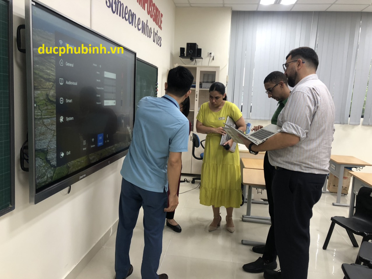Còn đây là hình ảnh chúng tôi hướng dẫn cho các giáo viên nước ngoài về cách sử dụng màn hình tương tác thông minh mà chúng tôi cung cấp